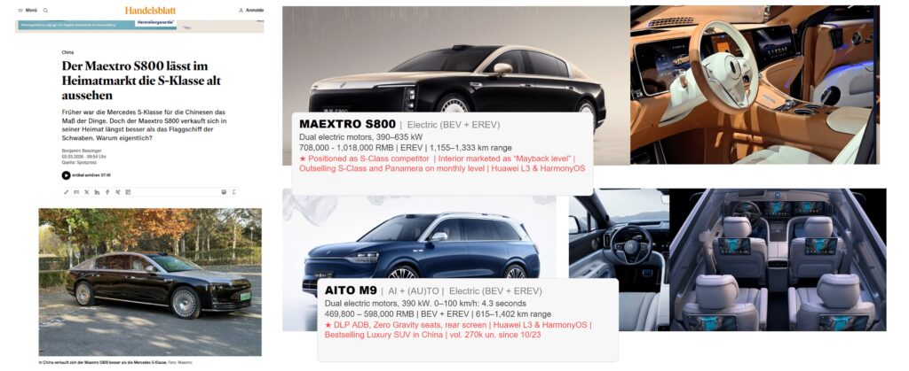 Tech-Luxury brands like Tesla, NIO, Li Auto, Yangwang, AITO, Maextro have redefined luxury through user experience, software, and AI rather than heritage alone. Their statement is Intelligence + User Experience + Ecosystem: Offering a Software-defined Vehicle (SDV) with superior intelligence in infotainment and autonomous driving, offering consumer electronics-like user experience (UX) like a rolling smartphone and access to the brands ecosystem of services and data, may it be Tesla’s supercharger network, driving data that enables FSD (the full self-driving mode) or full integration to Huawei’s HarmonyOS or Xiaomi’s MiUI environment of apps, smart devices and services.