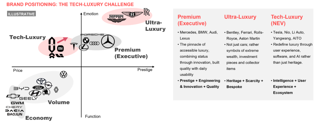 What makes the current challenge fundamentally different from any previous competitive threat is this: Tesla and Chinese tech-luxury brands are not trying to beat German premium brands at their own game. They are creating an entirely new game. The automotive premium market has historically been organized along two dimensions: prestige and emotion. Instead of building emotion through (combustion) engine power and luxury insignia, they play the technology game.